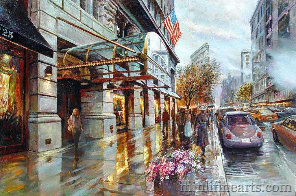 This urbanscape of the cosmopolitan New York Park Avenue on the Upper East Side NYC is a strong representative of Min's city scenery. The Grand Central Terminal façade and Pan Am Building stand proudly at the center of this cityscape. A skillful mesh of perspective and subtle, cool tones bring to life the steel and concrete spires of Manhattan. From a flat canvas, one feels at the foot of the Grand Hyatt New York and the Chrysler Building along 42nd Street in Midtown.