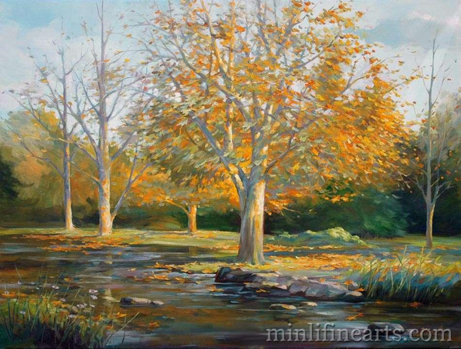 One of Min’s own favorite works, the Golden Fall shows a virtuoso at work. The painting is a skillful menagerie of expert techniques: the sweeping and falling quality of the floral arrangement, wide range of color, lighting, reflection and varying degrees of thickness and tone make the Golden Fall a lyrical “oeuvre d'art.â€