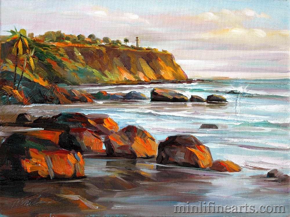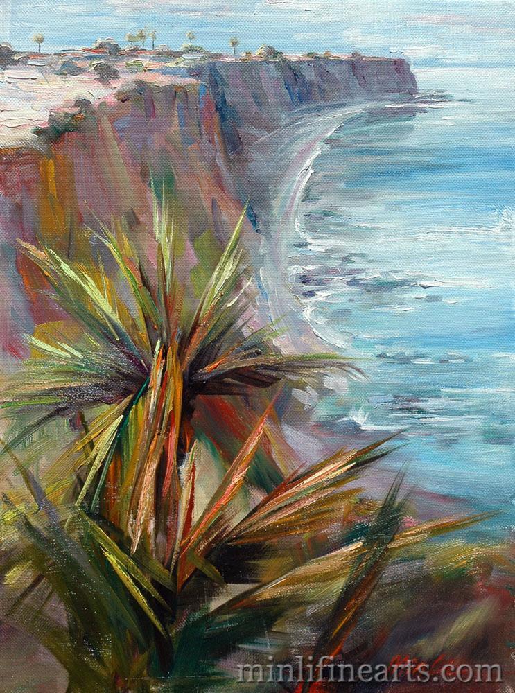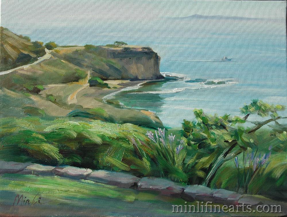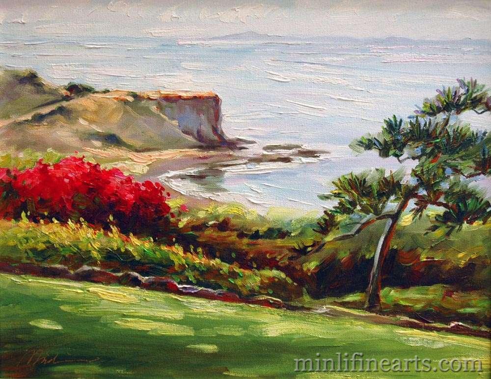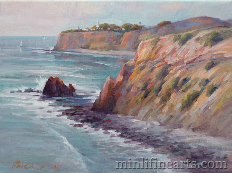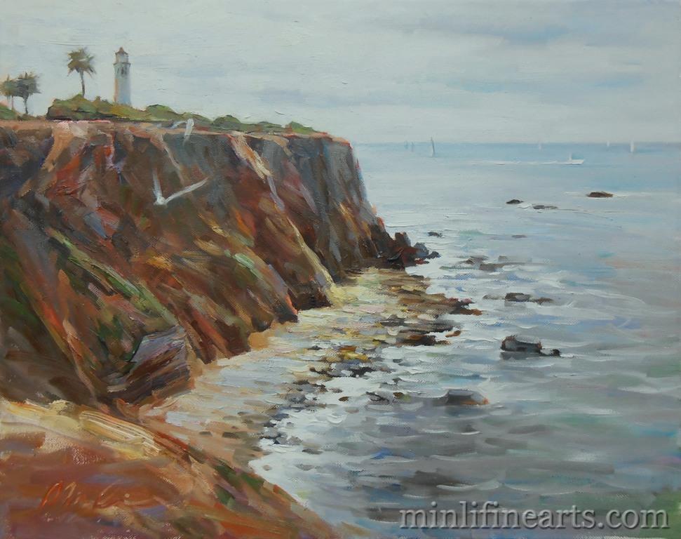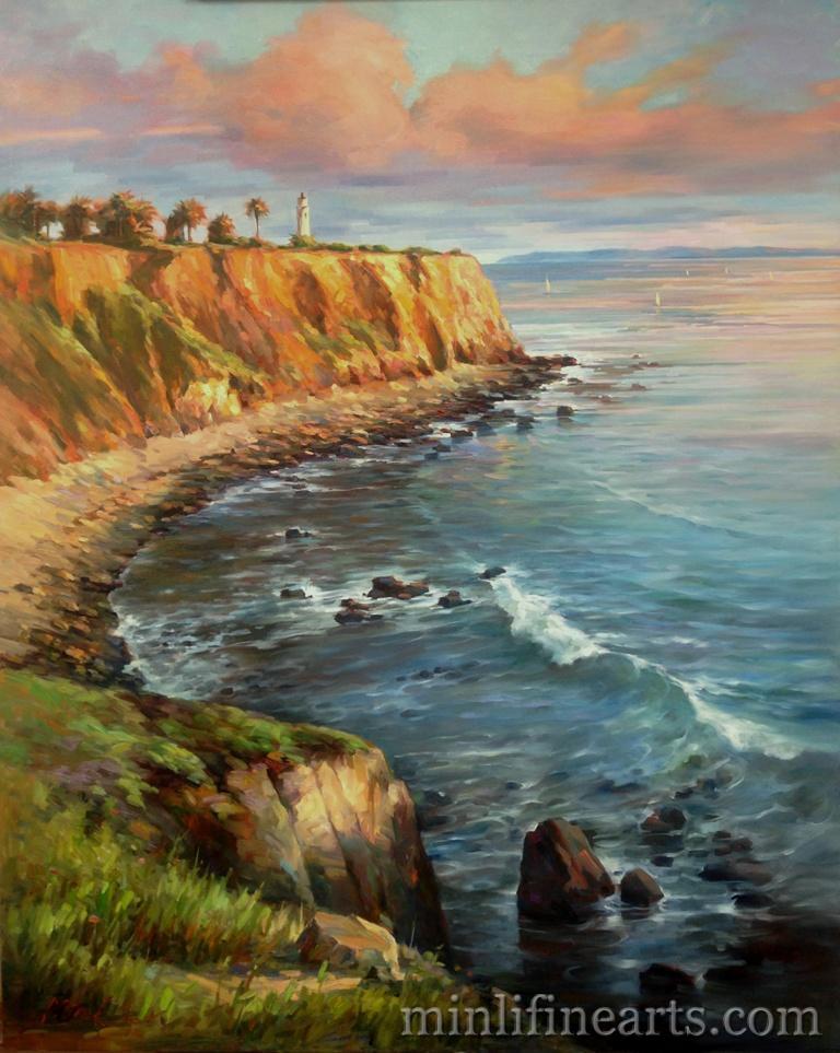 The Rancho Palos Verdes Peninsula, home to the Point Vicente Lighthouse, Marymount College and the Donald Trump Estate, is masterfully portrayed in Min’s plein air oil painting.