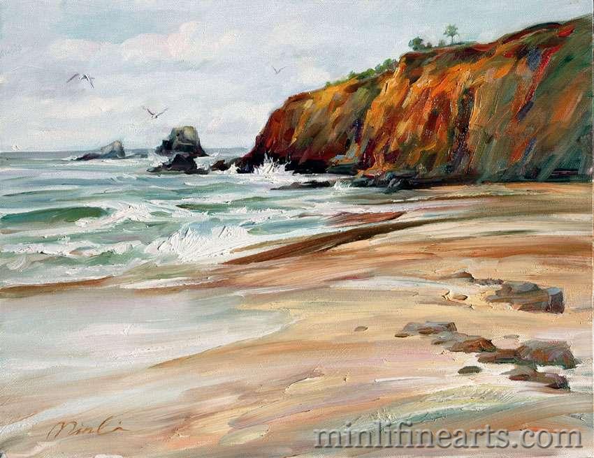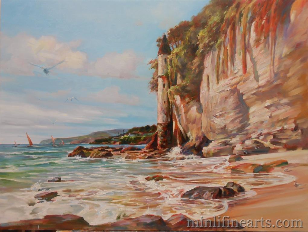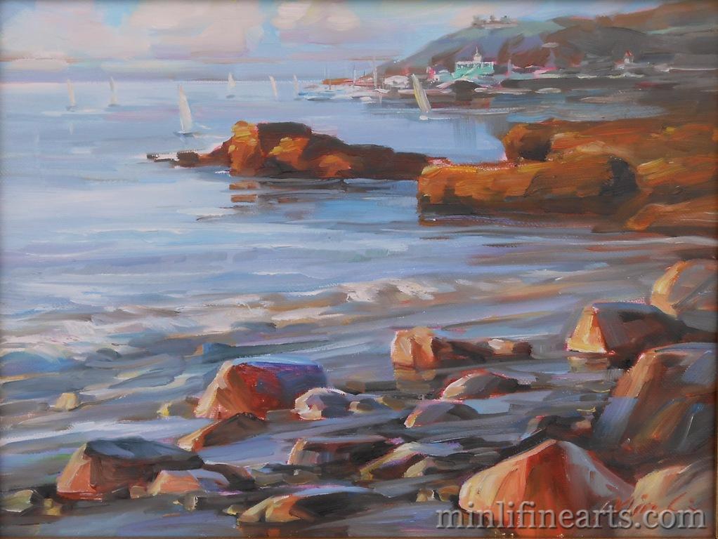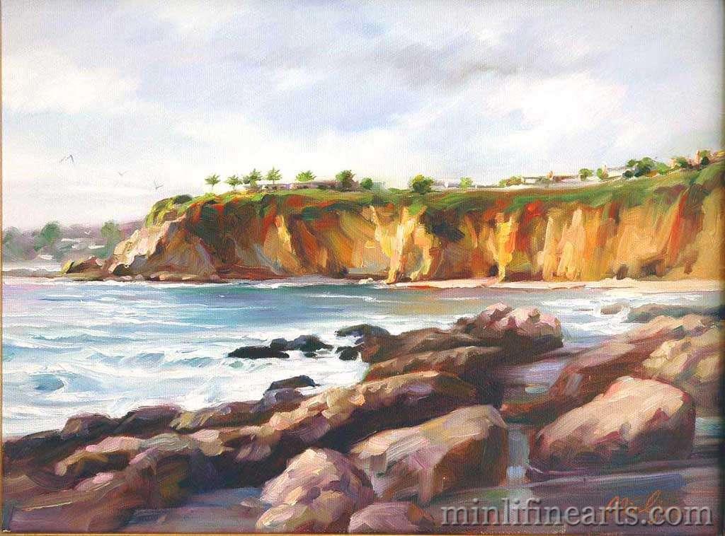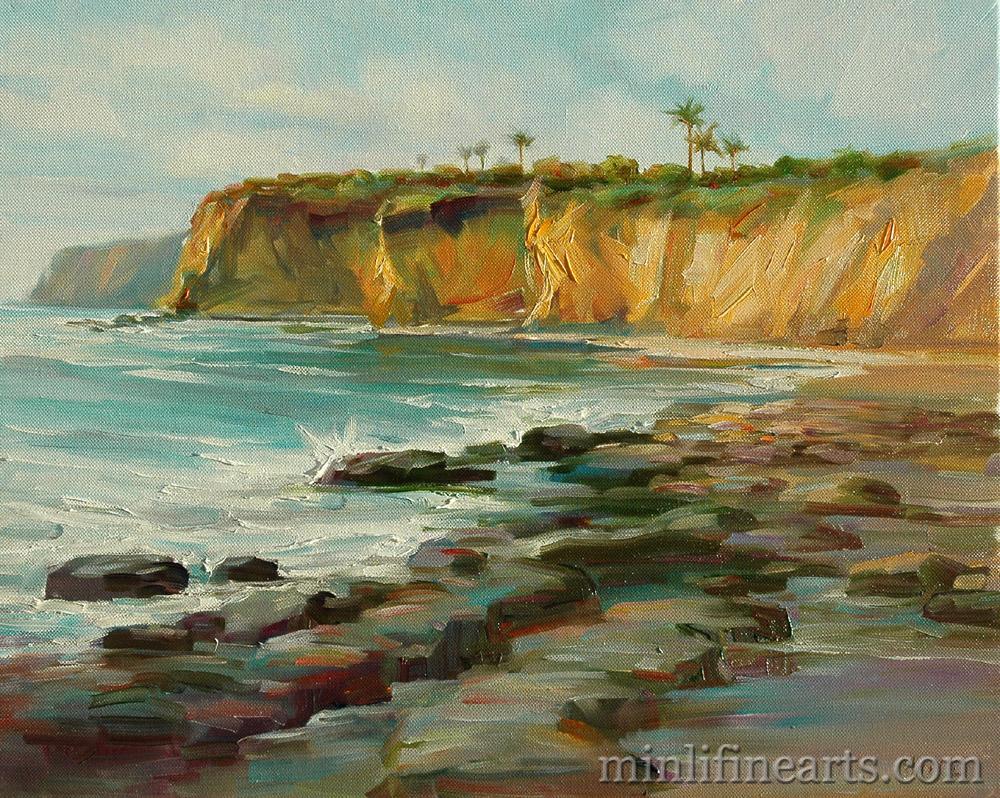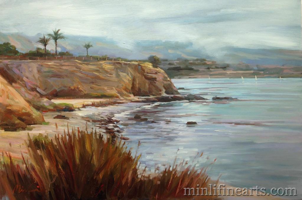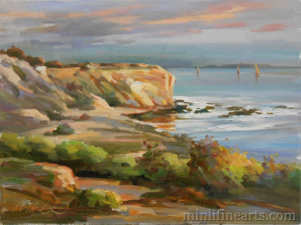 The Rancho Palos Verdes Peninsula, home to the Point Vicente Lighthouse, Marymount College and the Donald Trump Estate, is masterfully portrayed in Min’s plein air oil painting.
