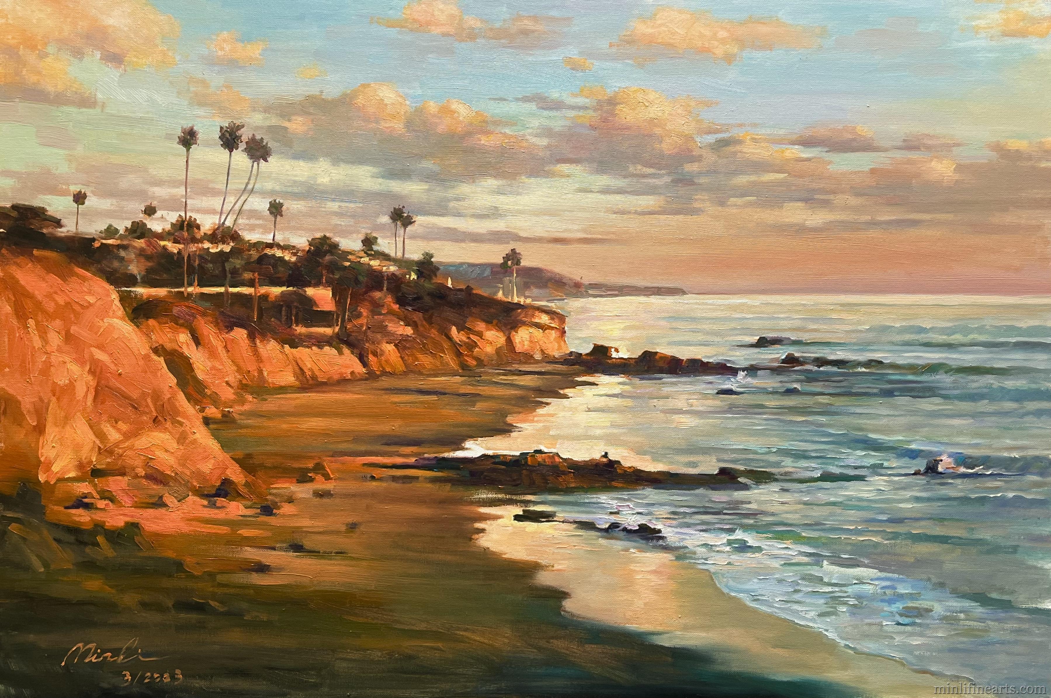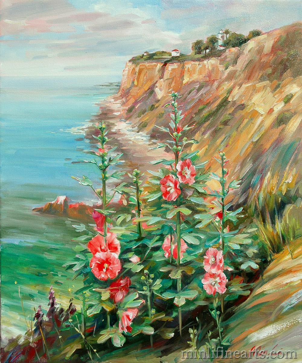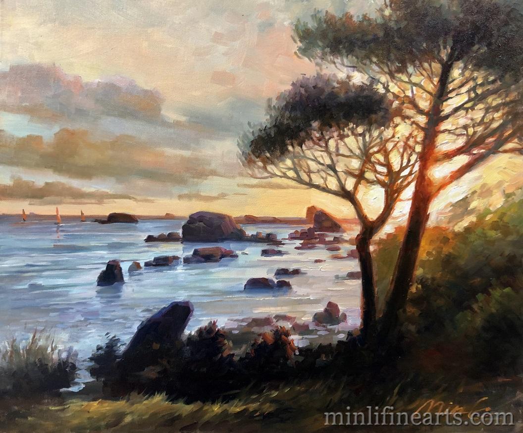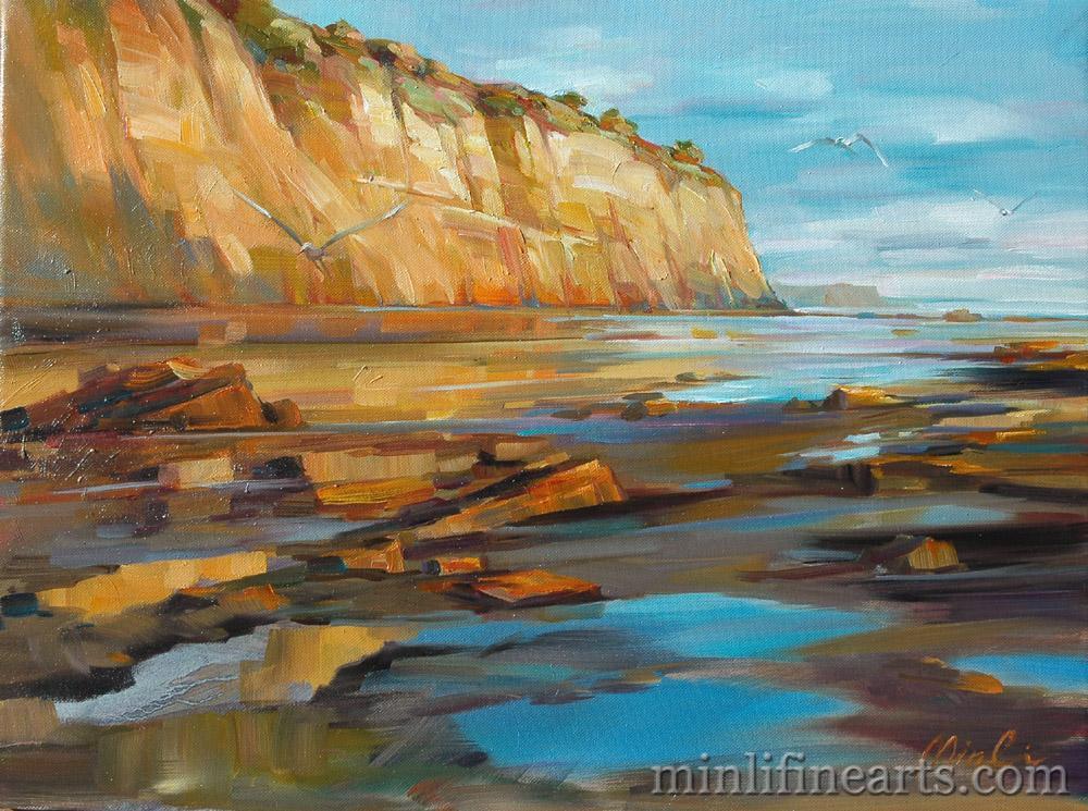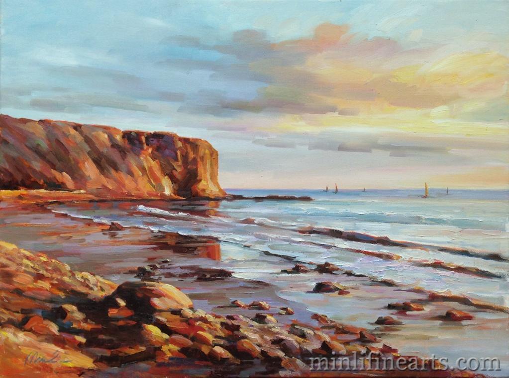 The Rancho Palos Verdes Peninsula, home to the Point Vicente Lighthouse, Marymount College and the Donald Trump Estate, is masterfully portrayed in Min’s plein air oil painting.