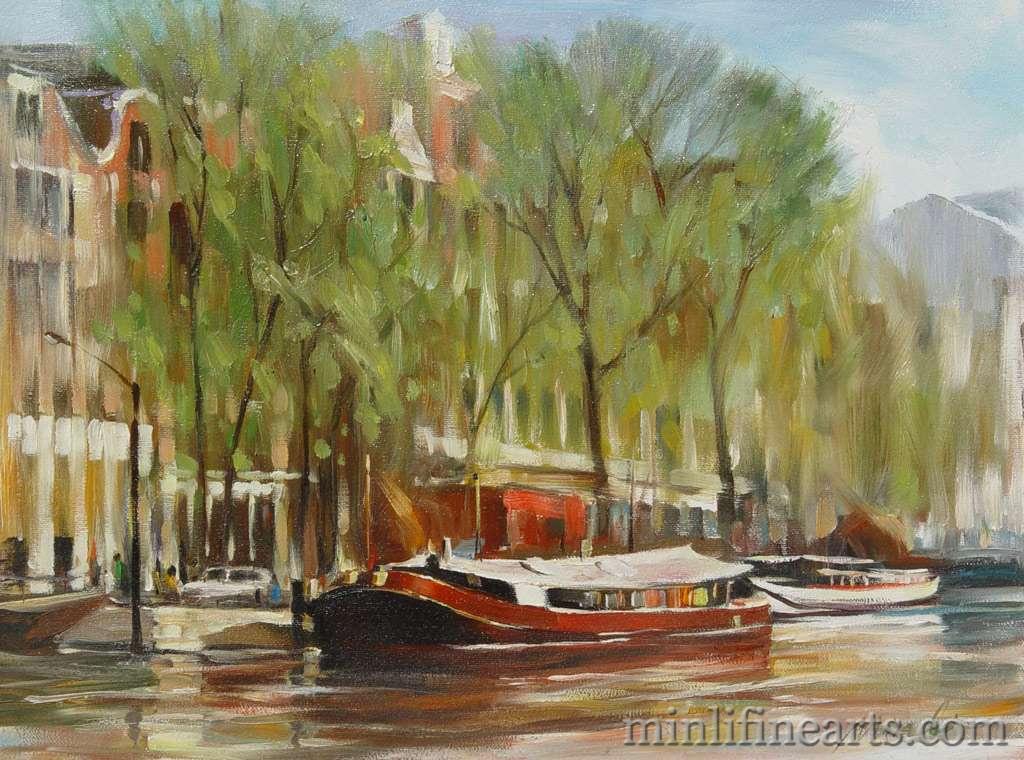 This oil captures a glimpse of Amsterdam's pituresque canal belt. The Amsterdam-Rijnkanaal waterway makes Amsterdam famous all over the world. This particular canal in the Netherlands was built to connect the port city of Amsterdam to the main shipping artery of the Rhine.