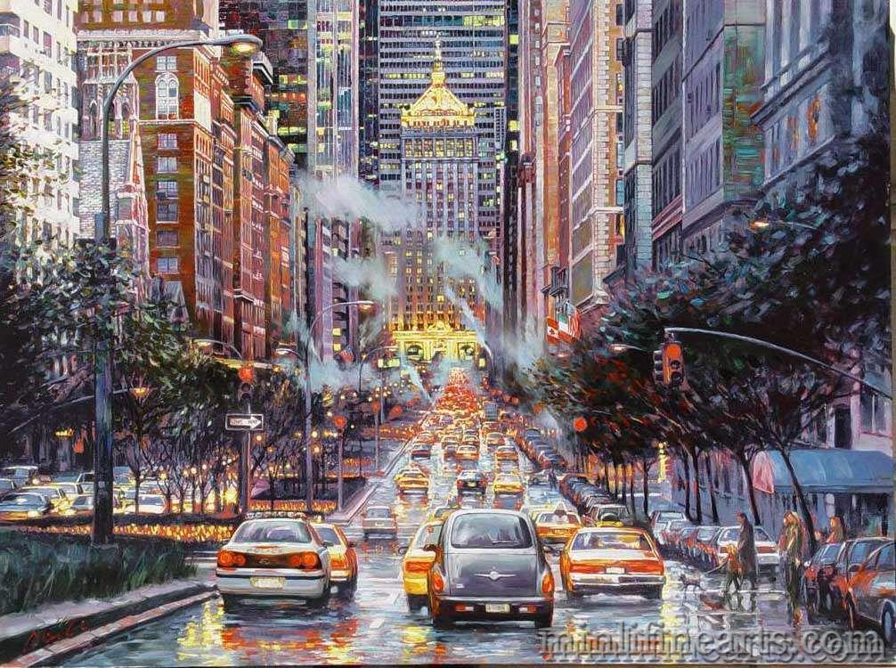 This urbanscape of the cosmopolitan New York Park Avenue on the Upper East Side NYC is a strong representative of Min's city scenery. The Grand Central Terminal façade and Pan Am Building stand proudly at the center of this cityscape. A skillful mesh of perspective and subtle, cool tones bring to life the steel and concrete spires of Manhattan. From a flat canvas, one feels at the foot of the Grand Hyatt New York and the Chrysler Building along 42nd Street in Midtown.