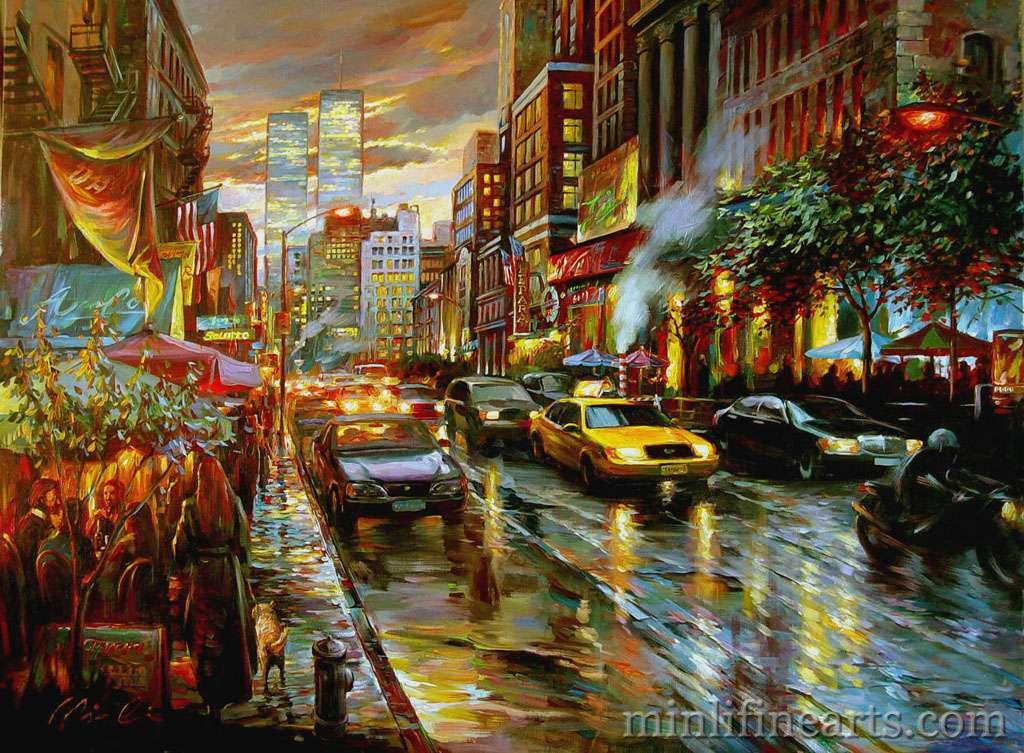 In New York Dawn Min tackles deep spatial representations of urban landscapes using photorealism techniques. This streetscape of New York depicts its bustling nightlife. The Twin Towers, located in the heart of New York City's downtown financial district, glow in impressionist colors. The canary yellow cab is the mainstay of the NYC commute and a focal point of this piece.