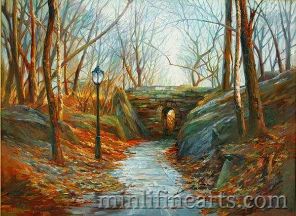 This mossy bridge was designed by the famous Calvert Vaux in the mid 1800s. Central Park, like its host City, is an organic synthesis of cultural diversity. From the Delacorte Theatre, to the NYC Marathon, to its historic sculptures and mini-ecosystem, the splendor of Central Park is captured by Min's tonal brilliance.