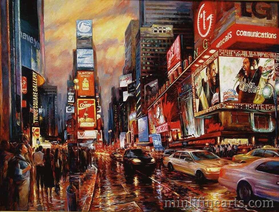 In this masterful cityscape, Min presents us with Broadway theatres, luminous neons, and the brilliant skyscrapers of Times Square. An icon of American culture, Min captures the spectacular combination of MTV, Nasdaq, and the Panasonic Astro Vision Screen. A place unique unto itself throughout history, this painting brings insightful depth into the title: Times Square.