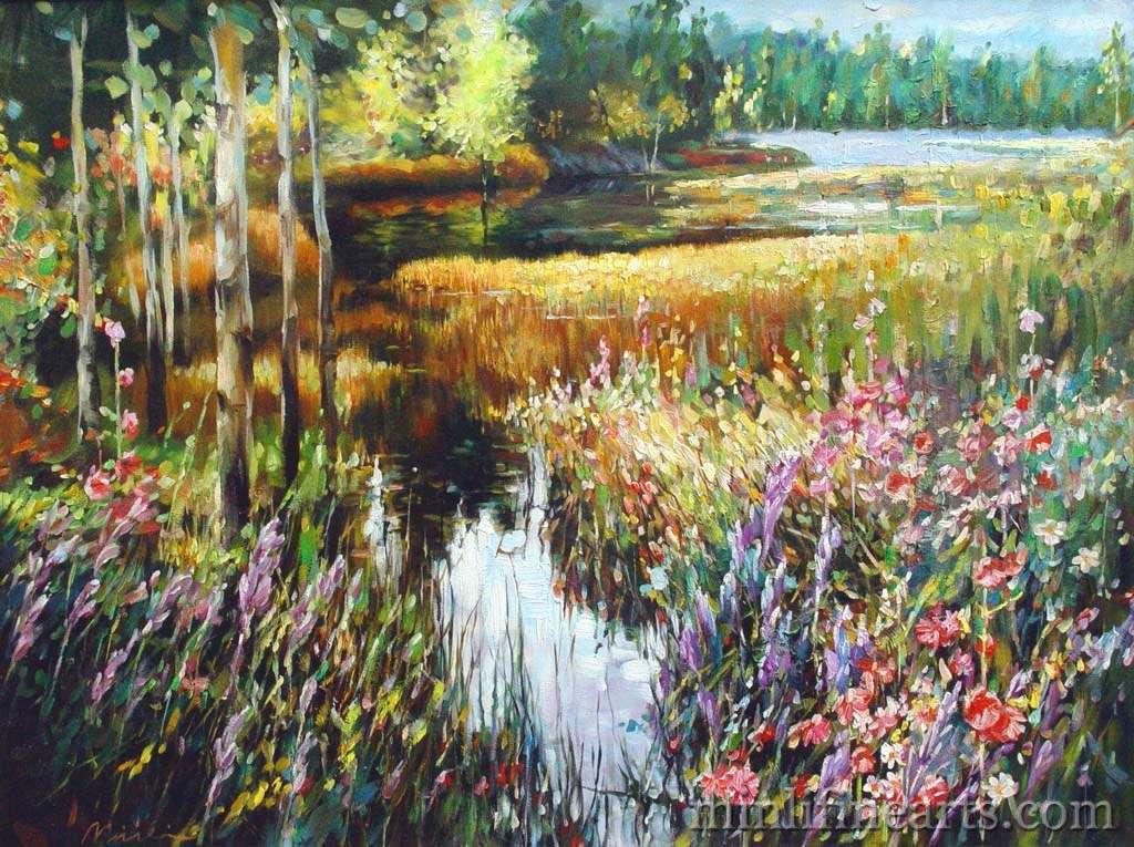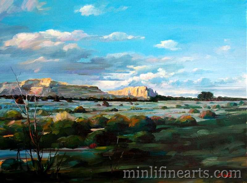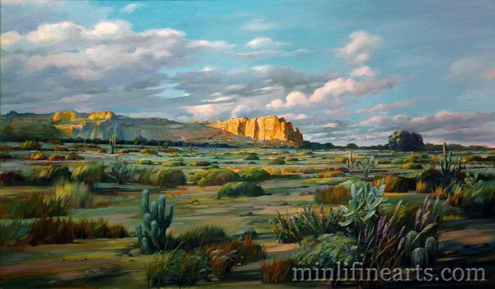 One of Min’s own favorite works, the Golden Fall shows a virtuoso at work. The painting is a skillful menagerie of expert techniques: the sweeping and falling quality of the floral arrangement, wide range of color, lighting, reflection and varying degrees of thickness and tone make the Golden Fall a lyrical “oeuvre d'art.â€