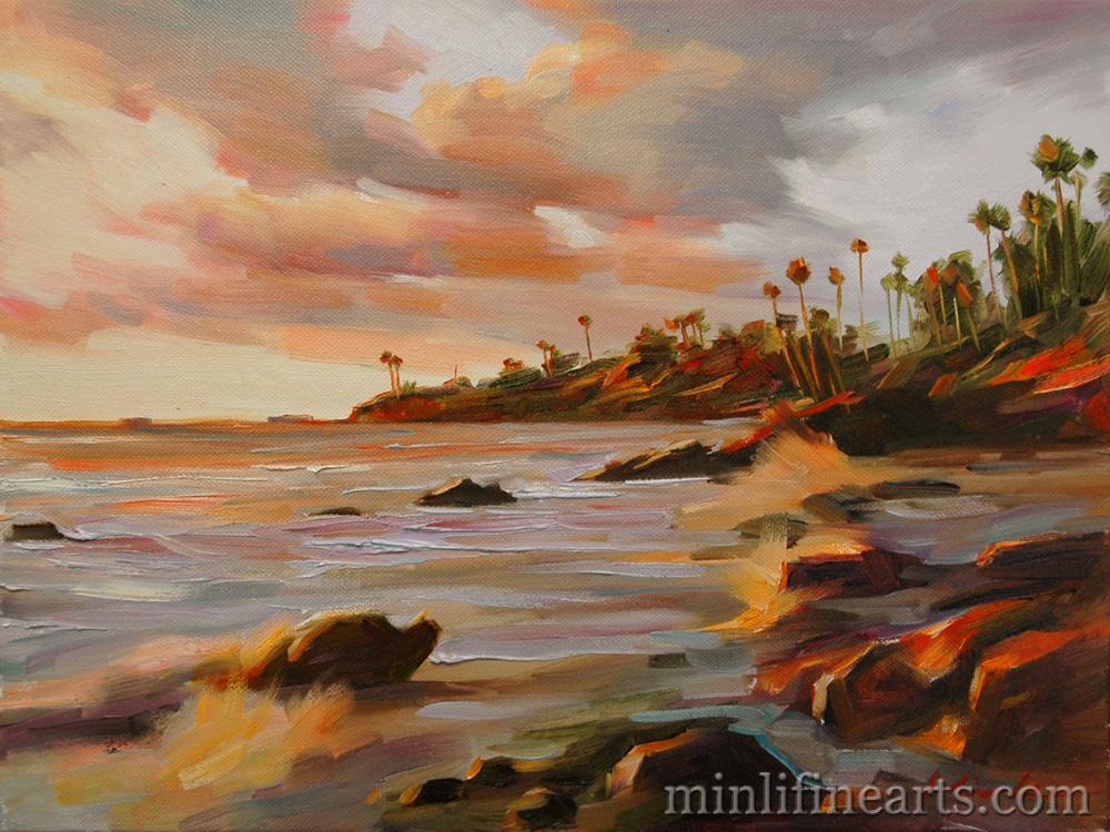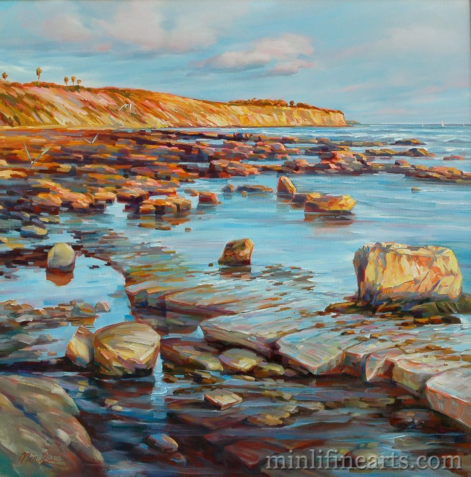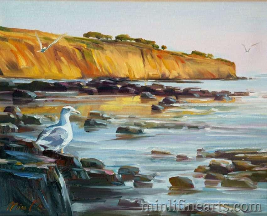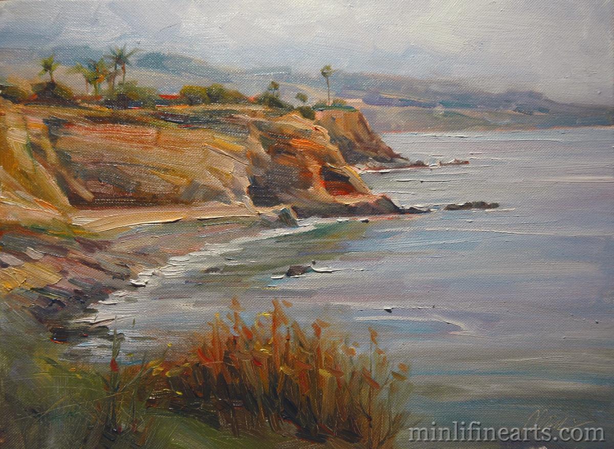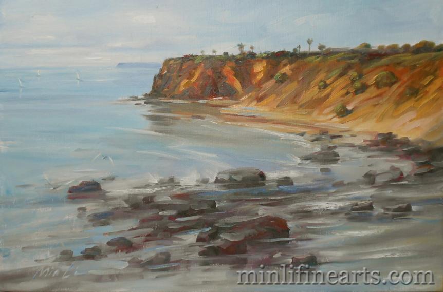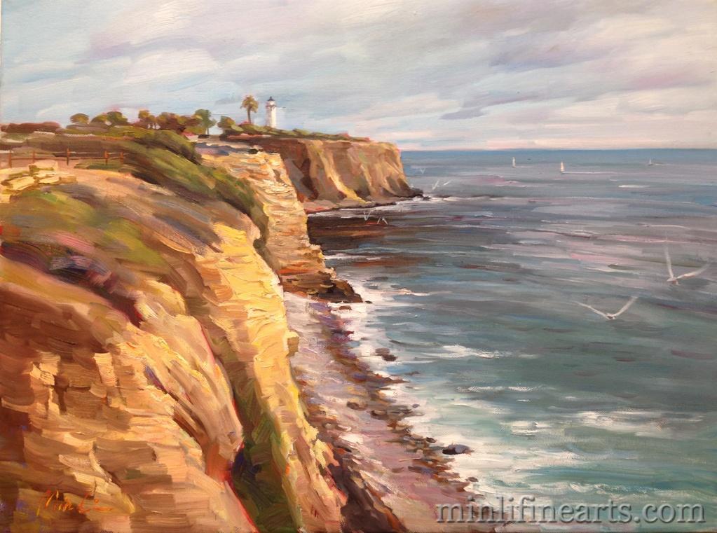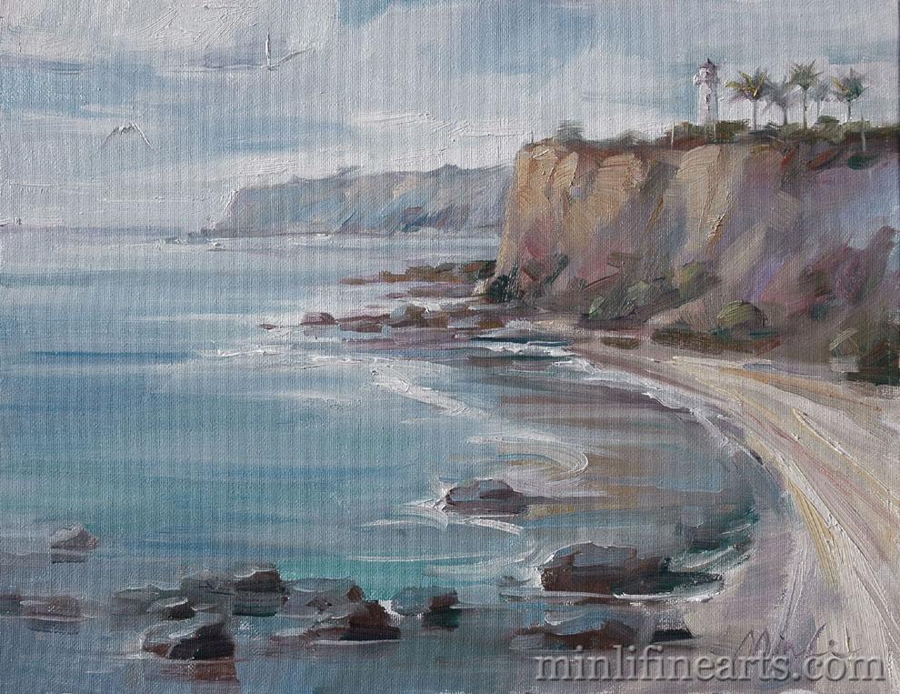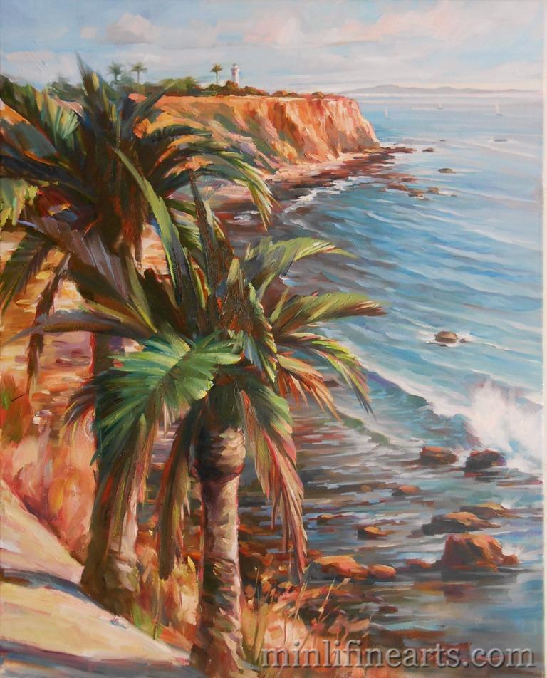The Rancho Palos Verdes Peninsula, home to the Point Vicente Lighthouse, Marymount College and the Donald Trump Estate, is masterfully portrayed in Min’s plein air oil painting.